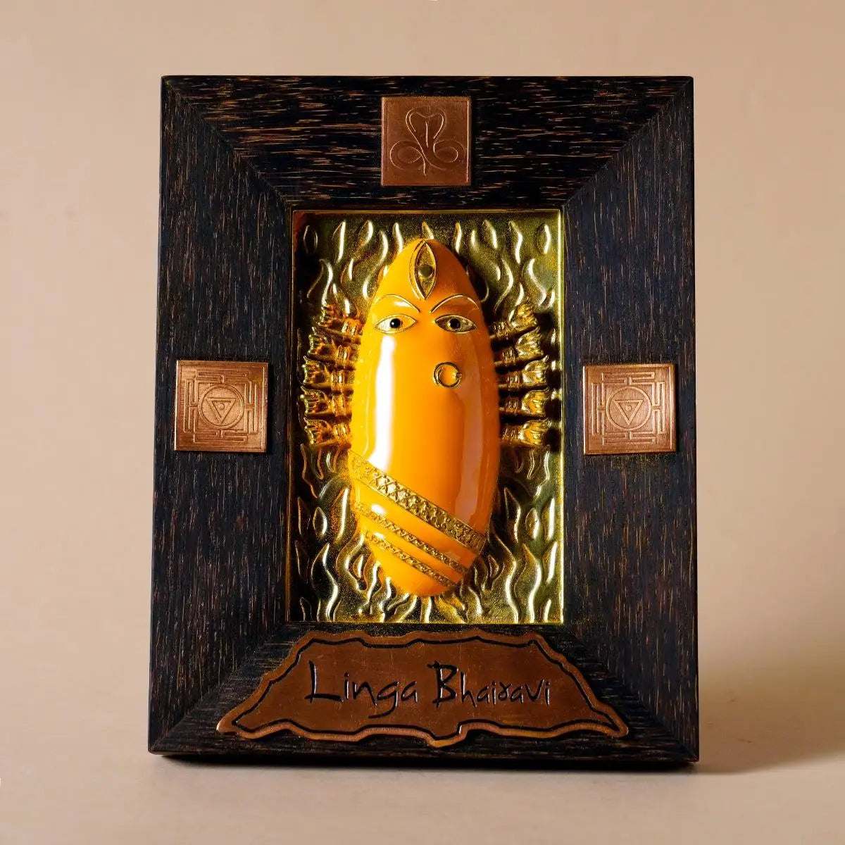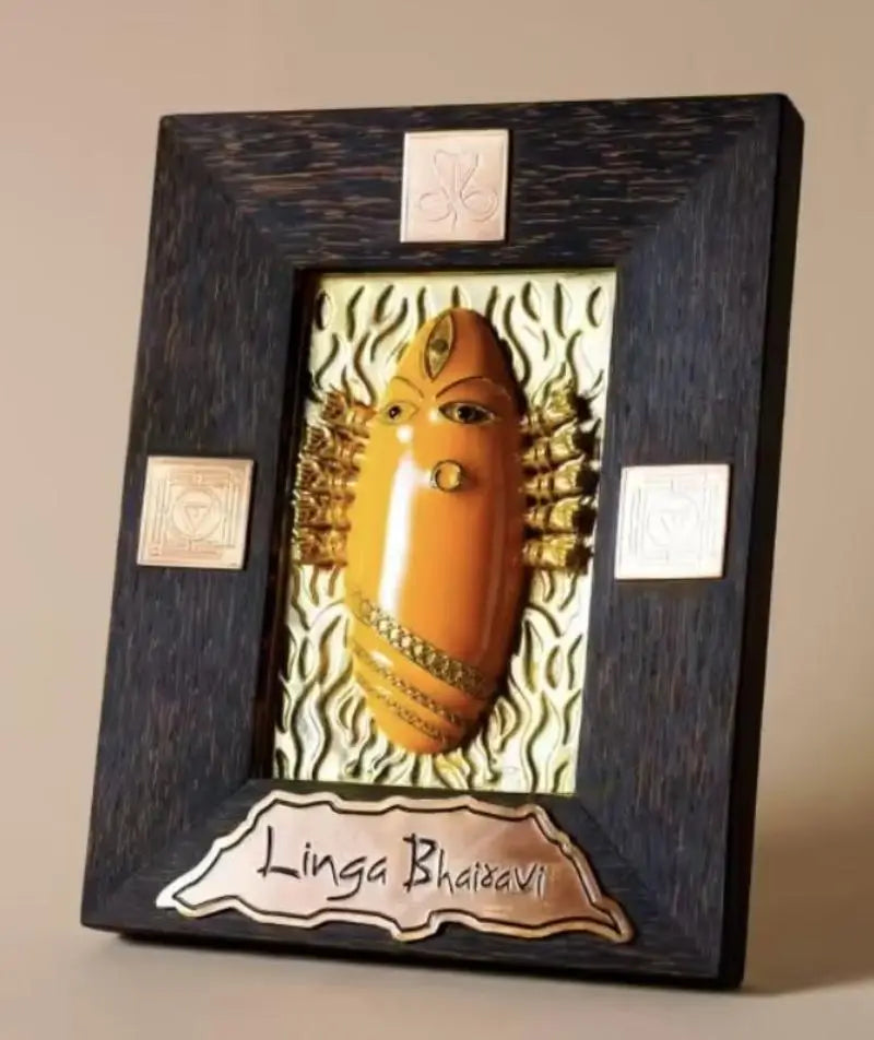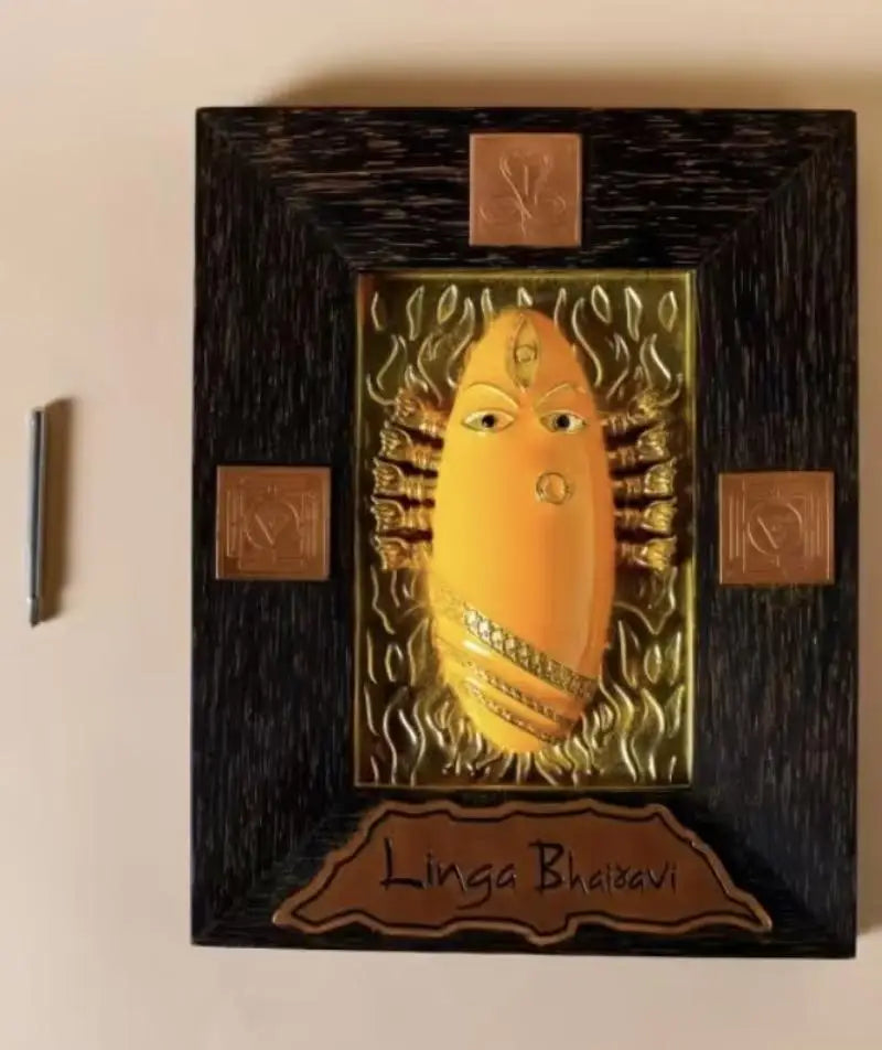 Embrace the divine energy of Linga Bhairavi with this sacred representation of her. Consecrated at her sacred abode, this Brass Devi Panel is bathed in the soothing hues of turmeric, embodying her nurturing and creative essence.