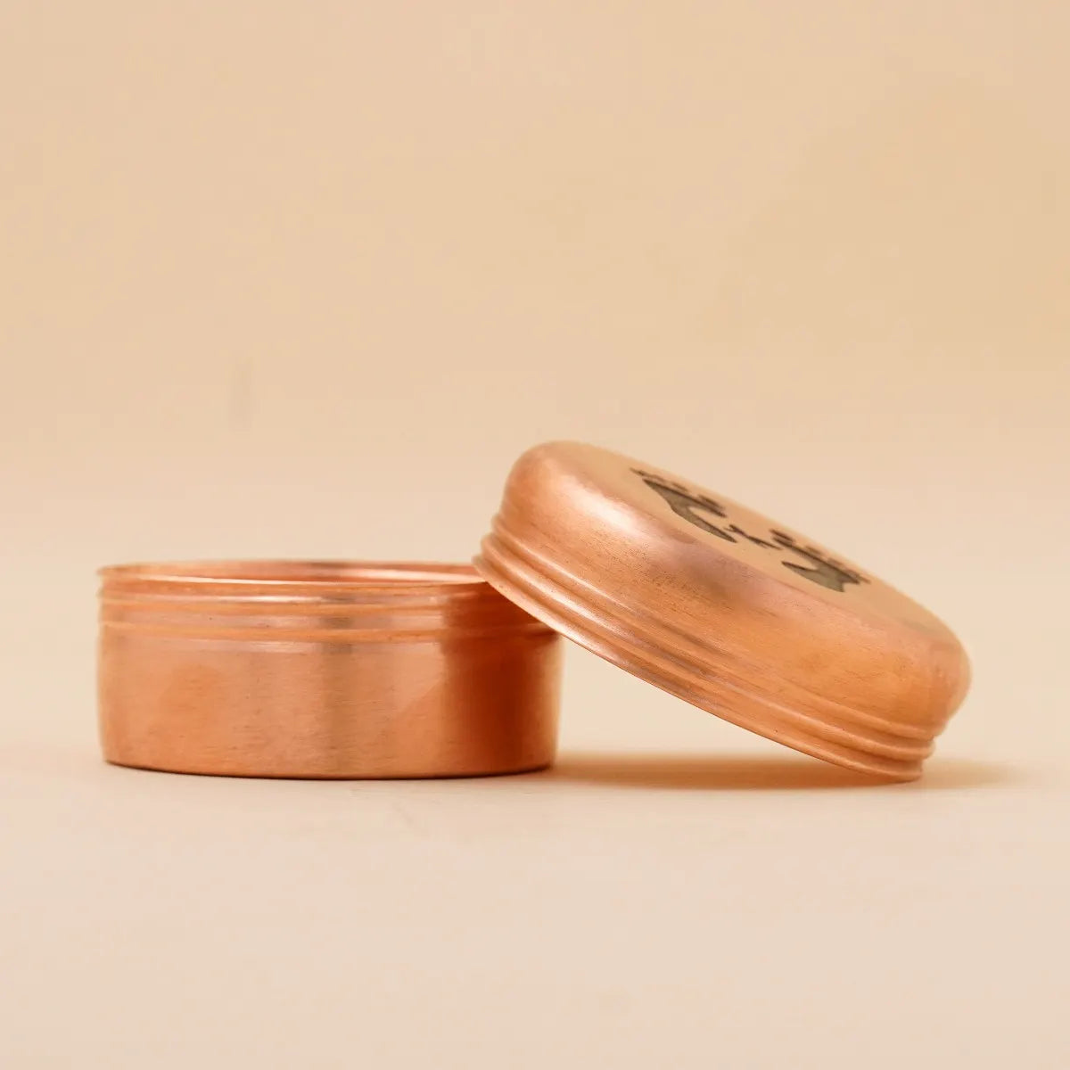 Carry Vibhuti, or the sacred ash, with you in this beautifully crafted Copper Vibhuti Box. The lid of the box is adorned with a captivating Padam, the revered “Sandals of the Guru” engraving, symbolic of the "the boat that helps to cross the endless ocean of life." In between the sandals, lies a tenderly etched flowerlet, symbolizing the blossoming of devotion and the beauty of surrender. Designed to preserve the sanctity of Vibhuti, this compact and elegant box ensures that the sacred ash remains untouched by external elements, ready to support your yogic practices.