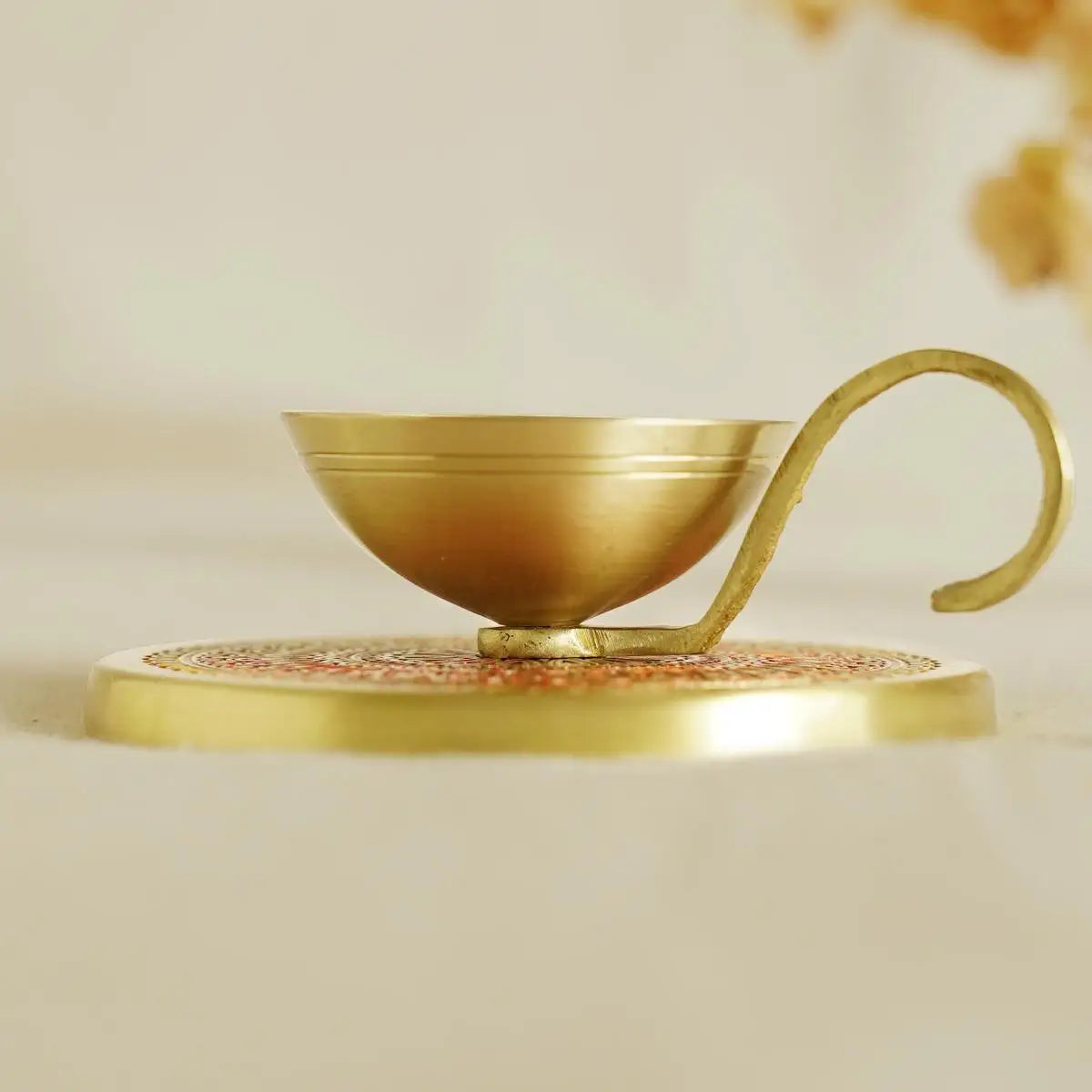 What sets this diya apart is its stylish handle, making it a visual delight and convenient to use. Then it has an attached plate, adorned with intricate and colourful mandala work, enhancing its beauty and creating a captivating presence in your puja room.